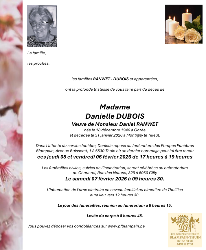 Nicole et Yves Présentent: leurs plus sincères condoléances à la famille RANWET – DUBOIS fils petits enfants et ses nombreux amis et connaissances