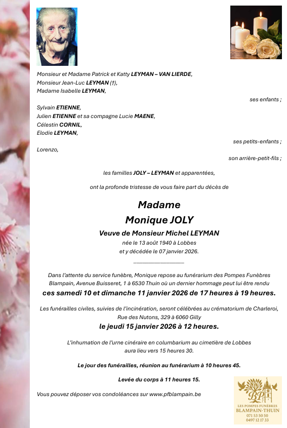 Avis nécrologique : Madame Monique JOLY.